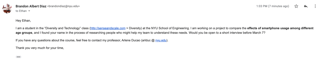 Blog Post #8: Email to Ethan Regarding Interviews Posted bybrndndzFebruary 27, 2020March 10, 2020Posted inUncategorized Email below to Ethan: Share this: Share on X (Opens in new window) X Share on Facebook (Opens in new window) Facebook Like Loading... Related